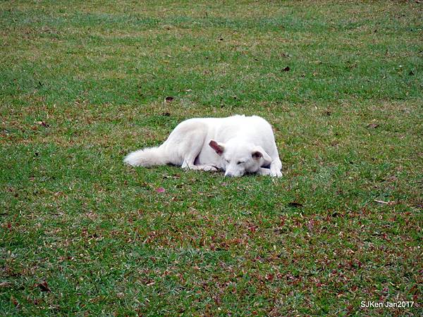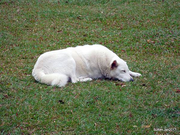 當天還看到一隻全白的狗狗在綠草如茵的草地上睡覺,不過動物的警覺天性與敏銳聽力,讓牠一聽到相機快門聲時就會張眼查看,即使我刻意距離很遠拍照,還是小小驚動牠,後來就趕緊離開,讓牠可以在那舒服安睡。