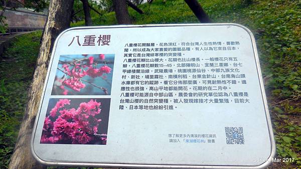 而2月下旬當時只綻放了一兩朵的八重櫻已然盛開,順著內溝溪橋畔步道前行到 2區,就會看到一整排的八重櫻已然盛開,開花的景況大約已經七八成,還有不少含苞待放的狀況。