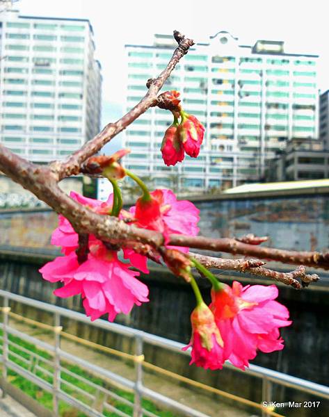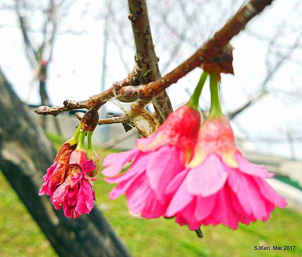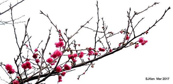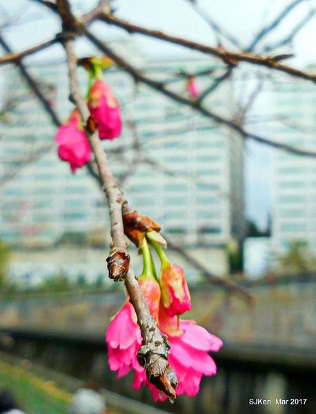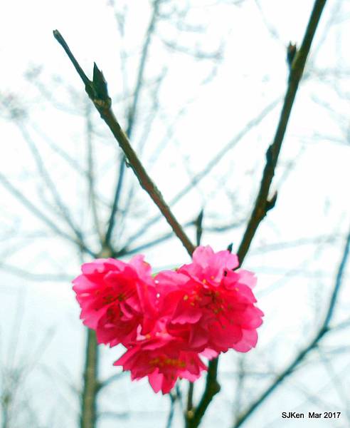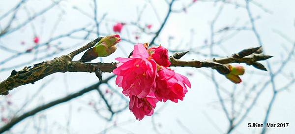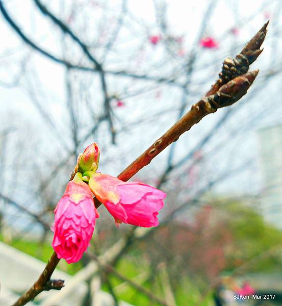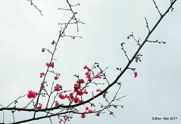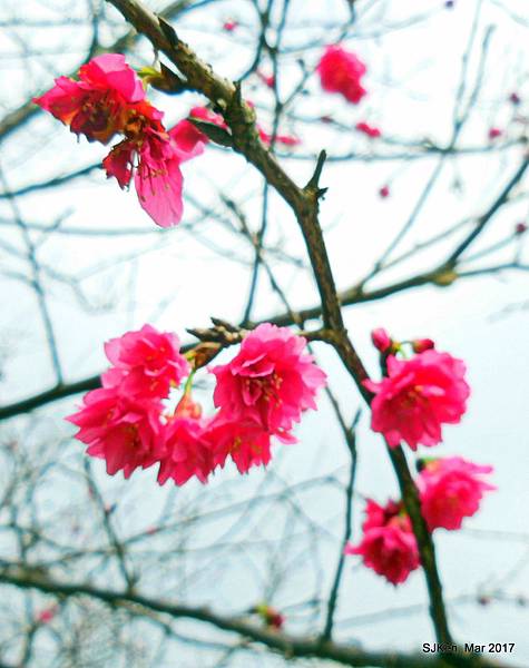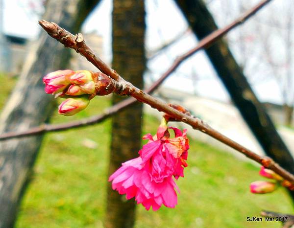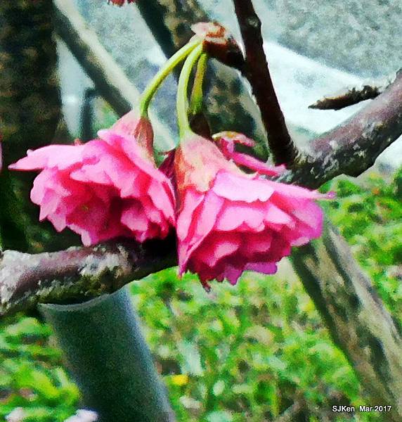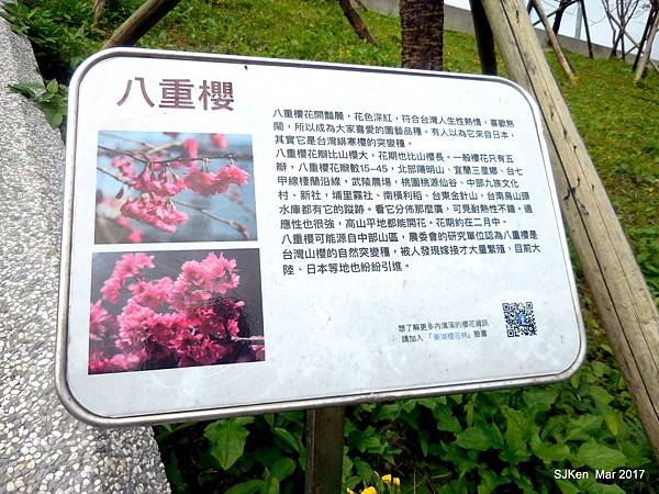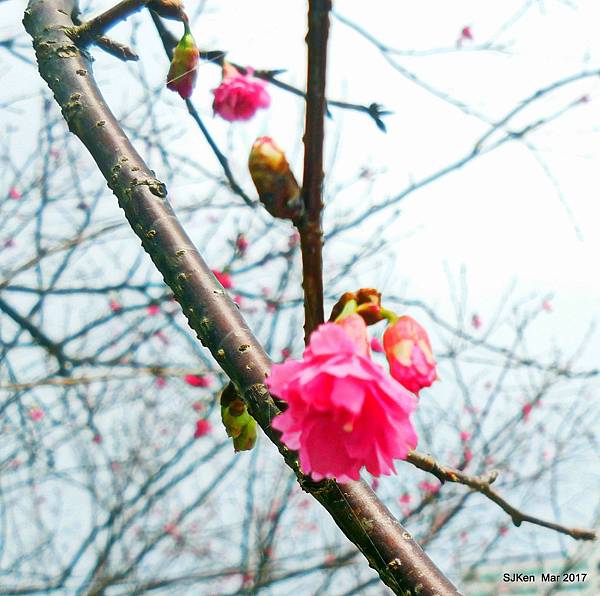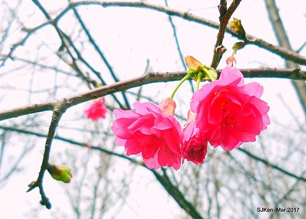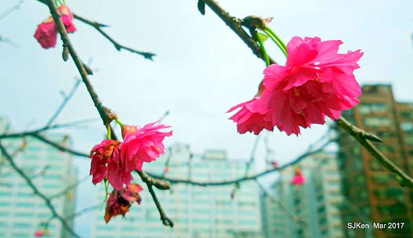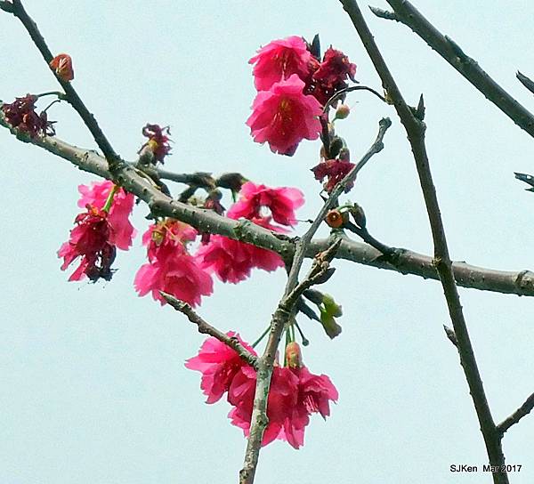 在台灣,「重瓣緋寒櫻」俗稱八重櫻或牡丹櫻,是台灣原生緋寒櫻的栽培種,花朵不大,花瓣多重,一開群聚經常數朵,顏色偏紫紅色,但整體上感覺沒有去年來得繽紛,或許到了三月中旬會開得更滿些!