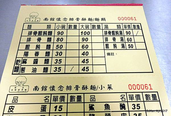 以這家生意鼎盛的「南館懷念排骨麵店」為例,營業時間從週一到週三 07:00 ~ 14:00 、週五到週日 07:00 ~ 19:00,然後每週四公休一天,進去店內,其實已經1點多,用餐的人客還不少,菜單以麵食與傳統在地小吃為主,價格都的都好平價,從10元到100元不等,我點了一份別地方吃不到宜蘭知名在地小吃「鴨賞」(NT$40)+「蔥油麵」(NT$35)+「排骨餛飩湯」(NT$90),每一道都很有特色,只花了NT$165,吃得很滿足。