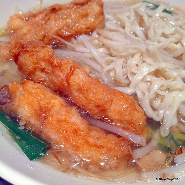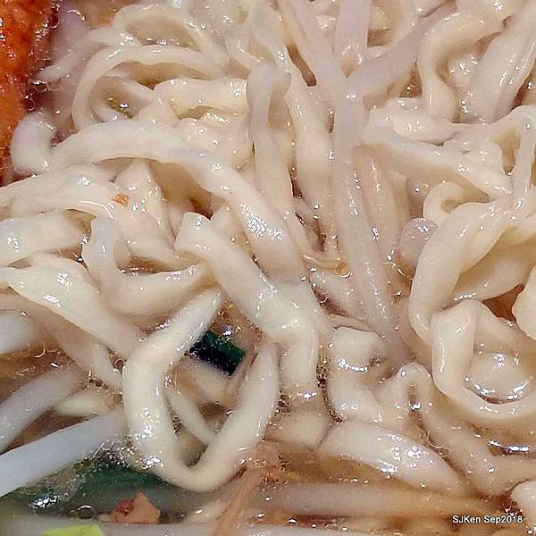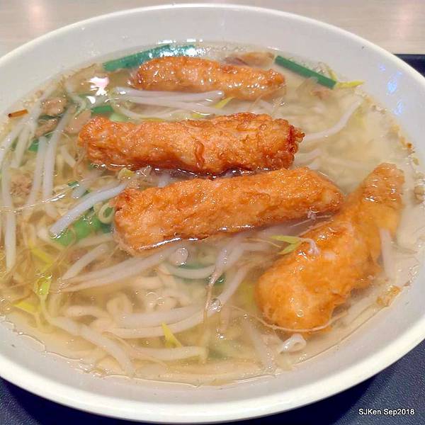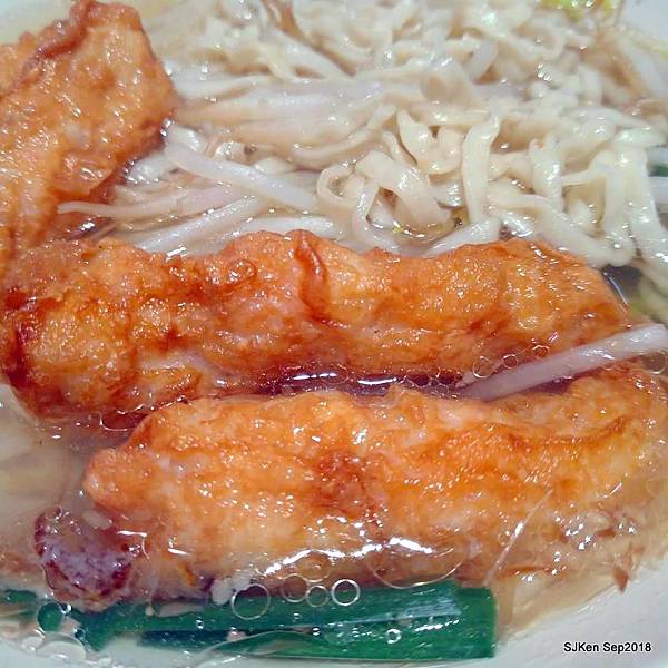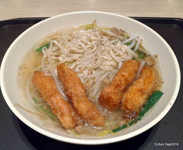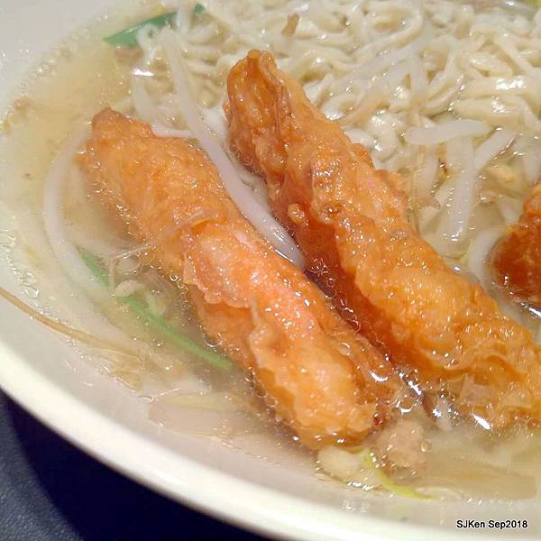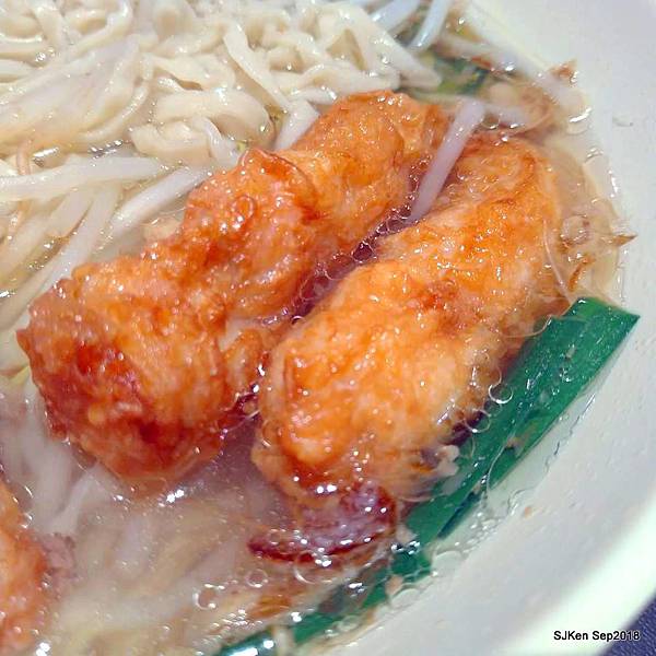 倒是這碗結合了台南兩道名產「台南蝦捲」與「台南意麵」的「蝦仁捲意麵」(NT$70)十分好吃,蝦仁捲厚實外酥炸內軟嫩,咀嚼起來很彈牙,意麵煮得軟硬剛剛好,不會過爛,加上簡單的豆芽菜與韭菜,湯頭鹹度與熱度也剛好,吃喝得很暢快!