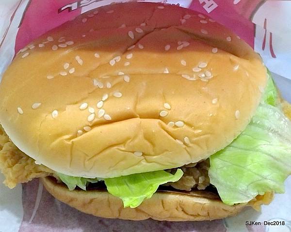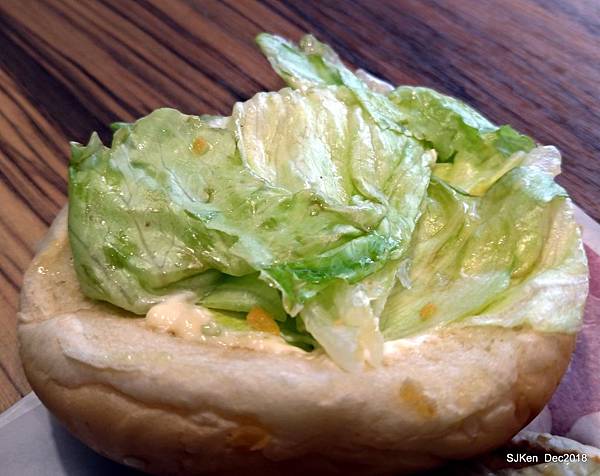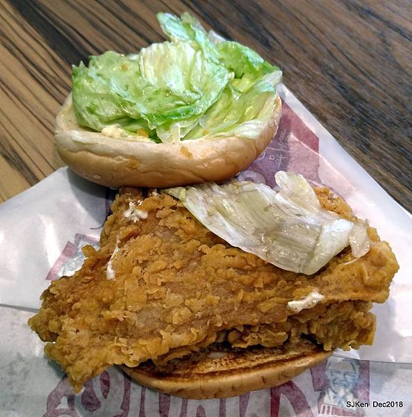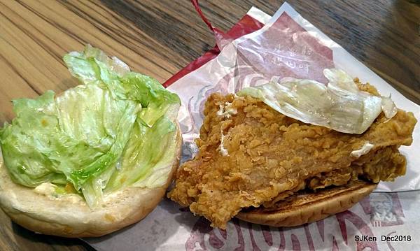 「咔啦雞腿堡」(NT$90),也是小小一塊,除了雞腿塊外,就只有生菜與獨門醬料調製,吃起來也沒有過往香脆。