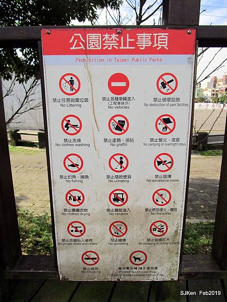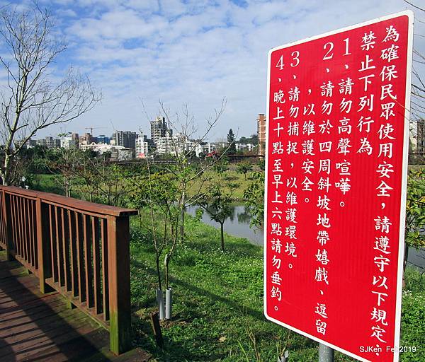 池畔新建的防雨木棧道十分明亮醒眼,旁邊還有告示板提醒民眾那些事不允許在生態公園裡進行。