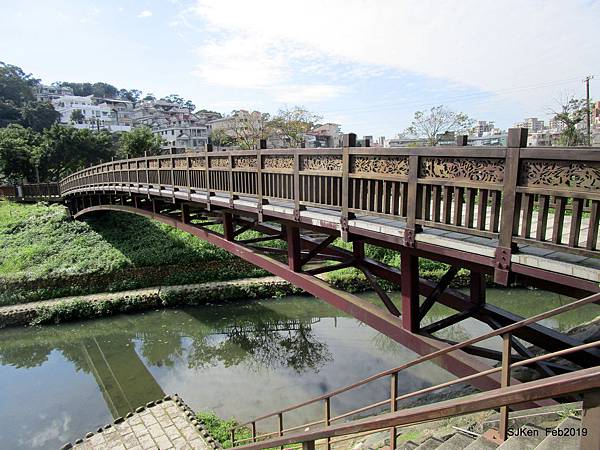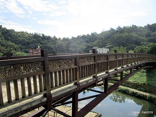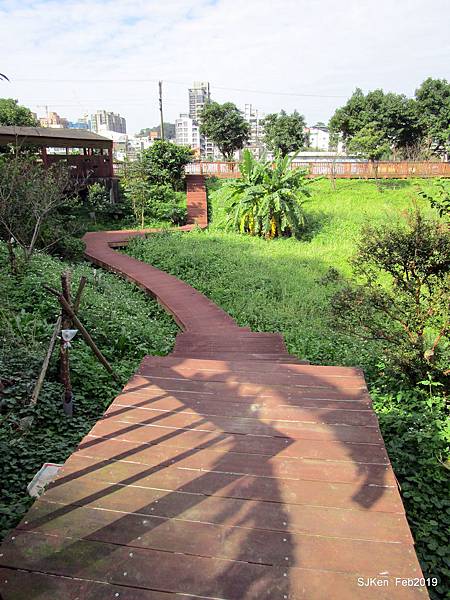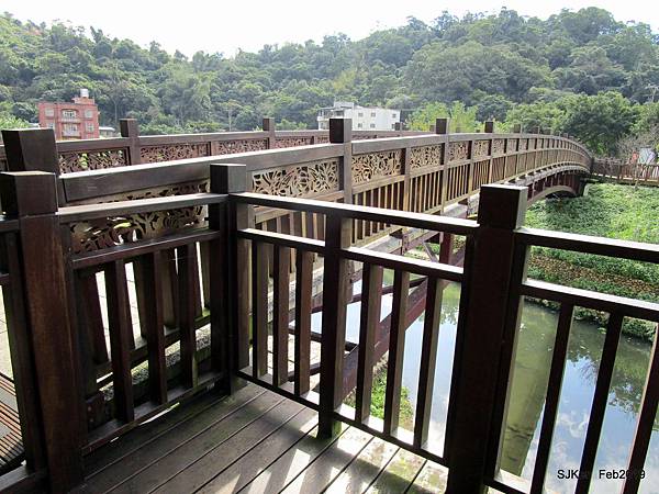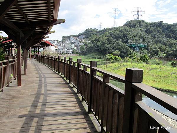 走不到3分鐘,眼前視野變得十分開闊,這邊往右上方看是有遮雨棚可供休憩的景觀區,延伸而出的拱橋,與對面汐止木棧道順著翠綠的池水相銜接,在不同季節造訪,可就近觀賞多種動植物的自然生態。