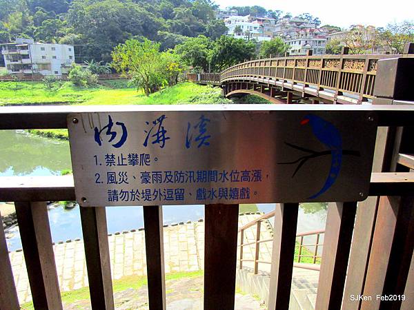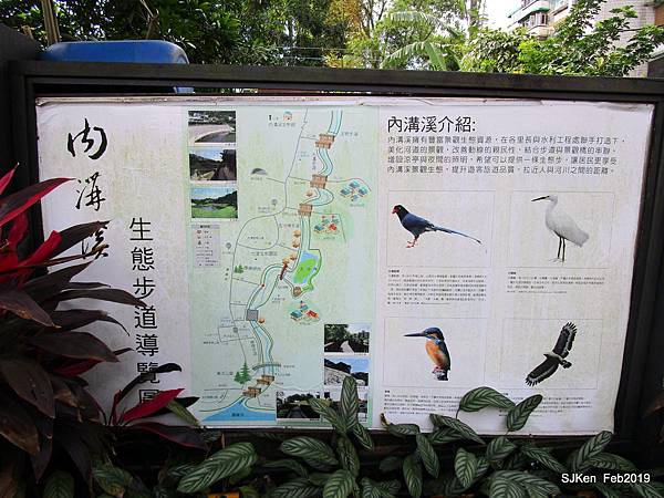 橋旁看到了內溝溪生態步道導覽圖看板,清楚說明整個導覽區,由上而下分成了「溪景步道」、「內溝步道」、「五分埤步道」與「樂康步道」,其中最為人熟知的進幾年經過媒體爭相報導,位於東湖「樂康步道」段的樂活公園,有寒櫻與八重櫻可賞的熱門賞櫻地點,但其實只要願意一路上行,就能欣賞到更多不同品種的櫻花與其它生態之美。