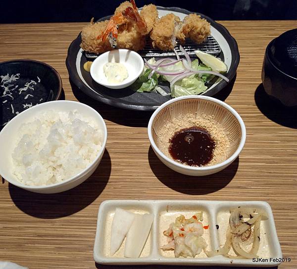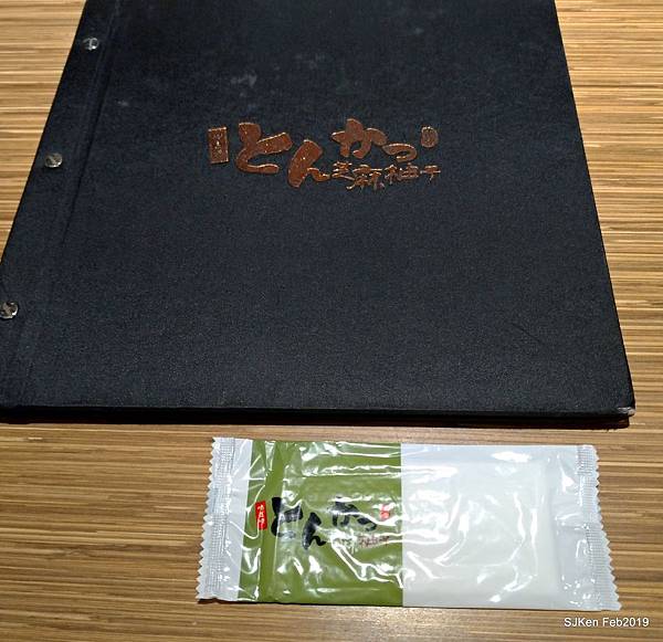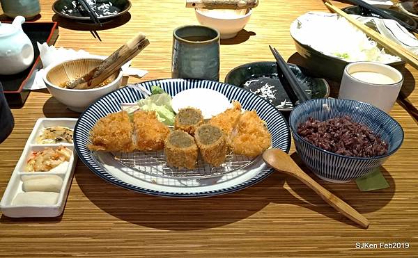 當天我們被安排在一樓入門左手邊靠牆,店員送上圖文並茂的菜單,我們點了「芝麻柚子招牌套餐」(NT$350/套)2套、「里肌肉豬排套餐(NT$330/小套)、「綜合野菇里肌豬排鍋膳」(NT$380/套)、「生薑燒鯖魚套餐」(NT$370/套)、「草蝦腰內豬排套餐」(NT$380/套)、「酥炸鮮牡蠣」(NT$330/份),加一成小費,一共是NT$3124,每份套餐都含一份甜點、一份飲品、高麗菜絲、茶碗蒸、味噌湯、三樣日式小菜、紫米飯,份量十足美味又超值!